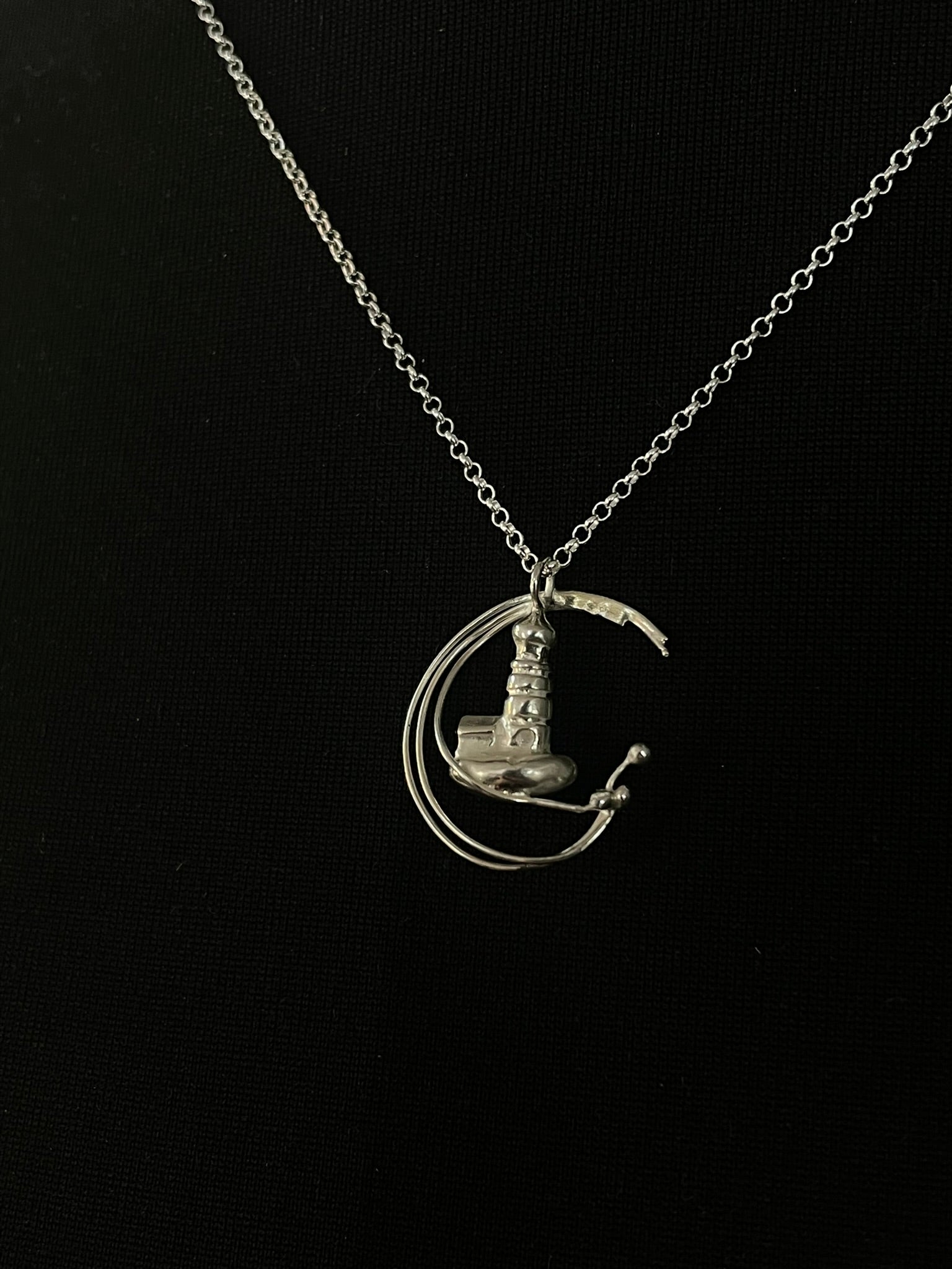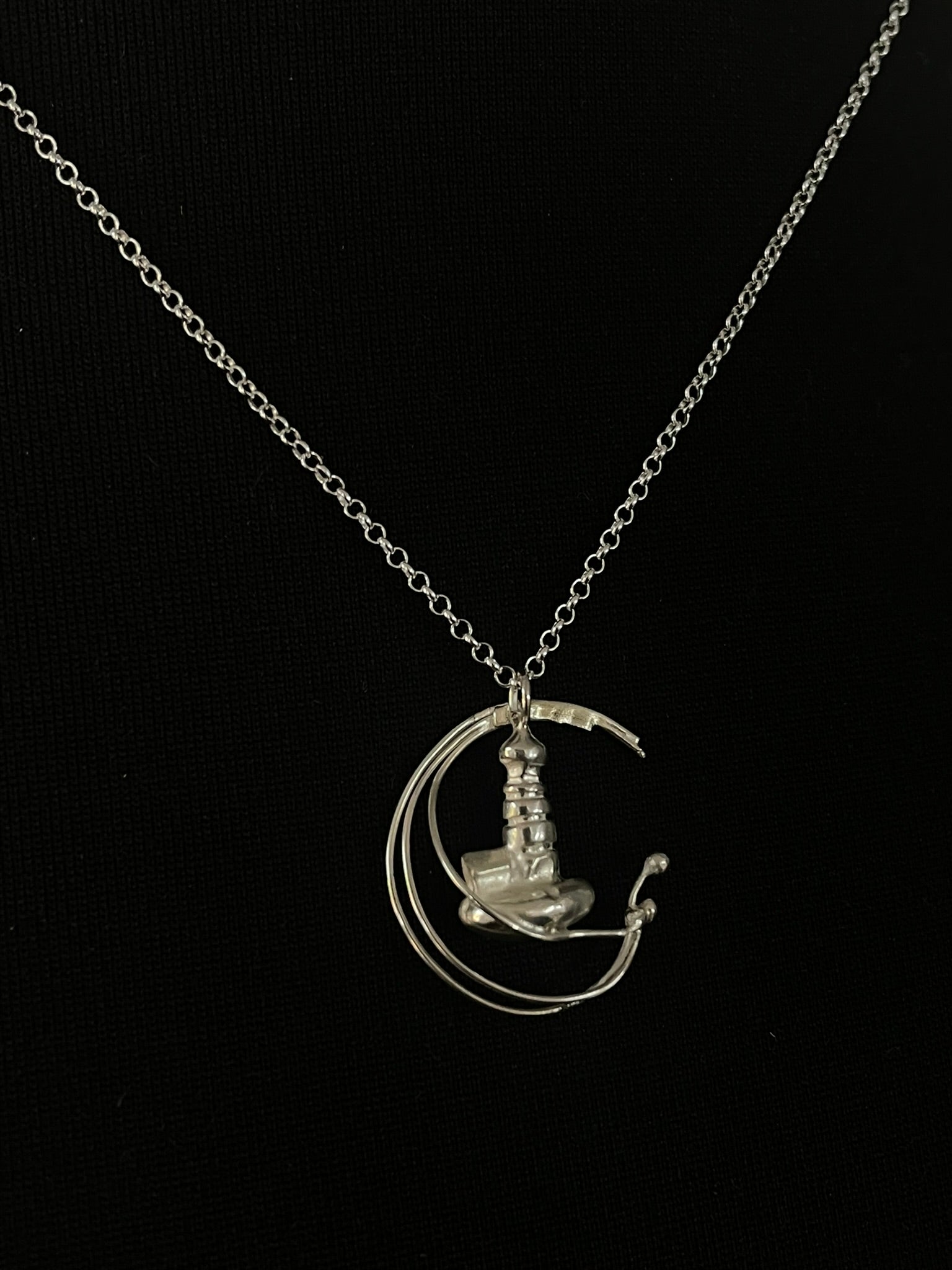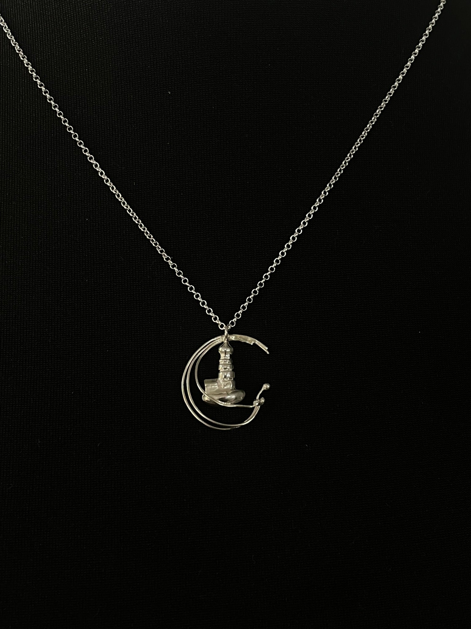 This exquisite sterling silver lighthouse captures a dramatic moment frozen in time, with waves crashing around its base in meticulous detail. The delicate craftsmanship showcases the interplay of light and shadow across the metal, creating depth and movement. Suspended on an 18-inch sterling silver chain, it sits perfectly at the collarbone, making it an ideal everyday pendant or a meaningful gift for those drawn to maritime heritage and nautical symbolism.