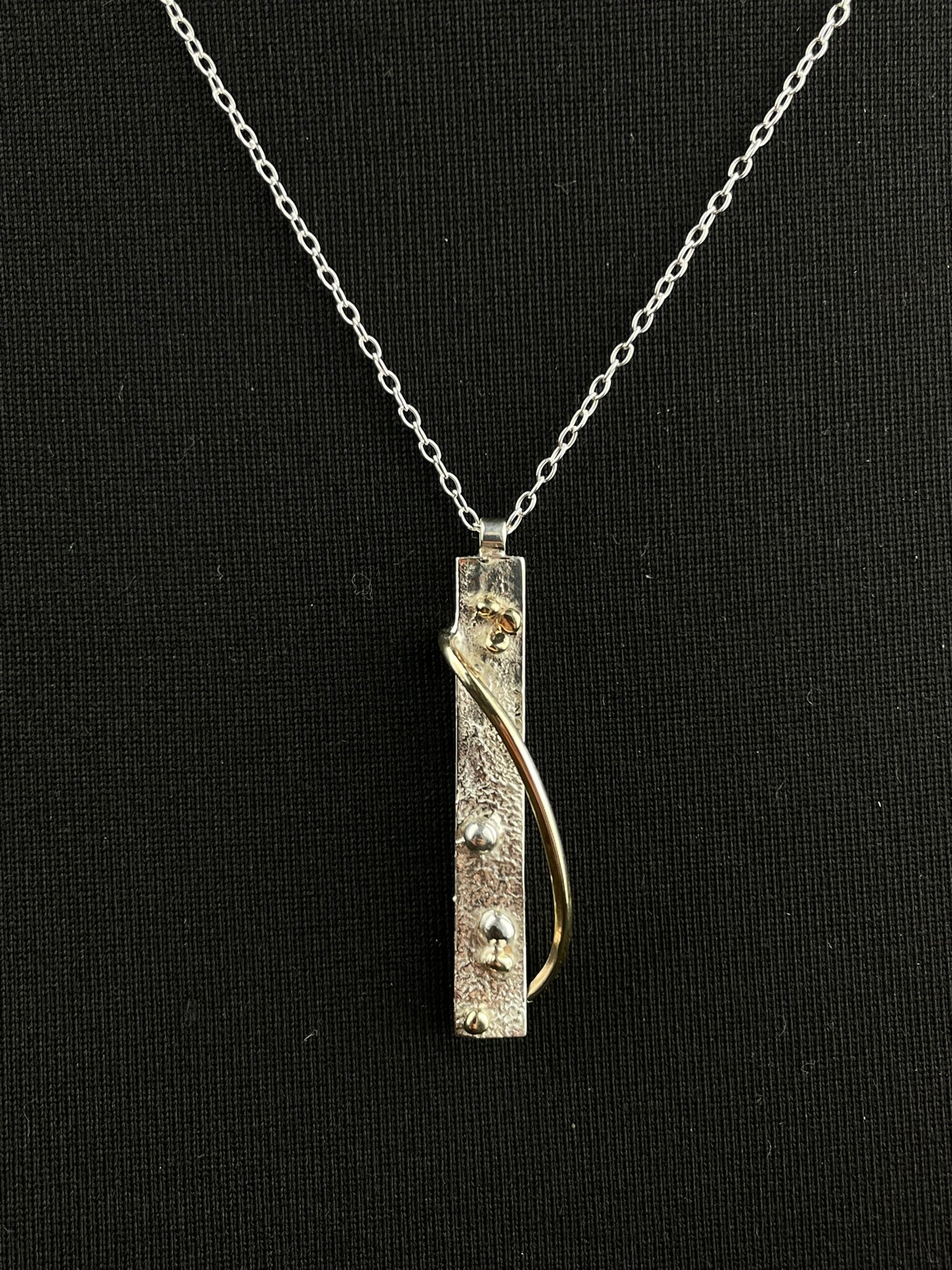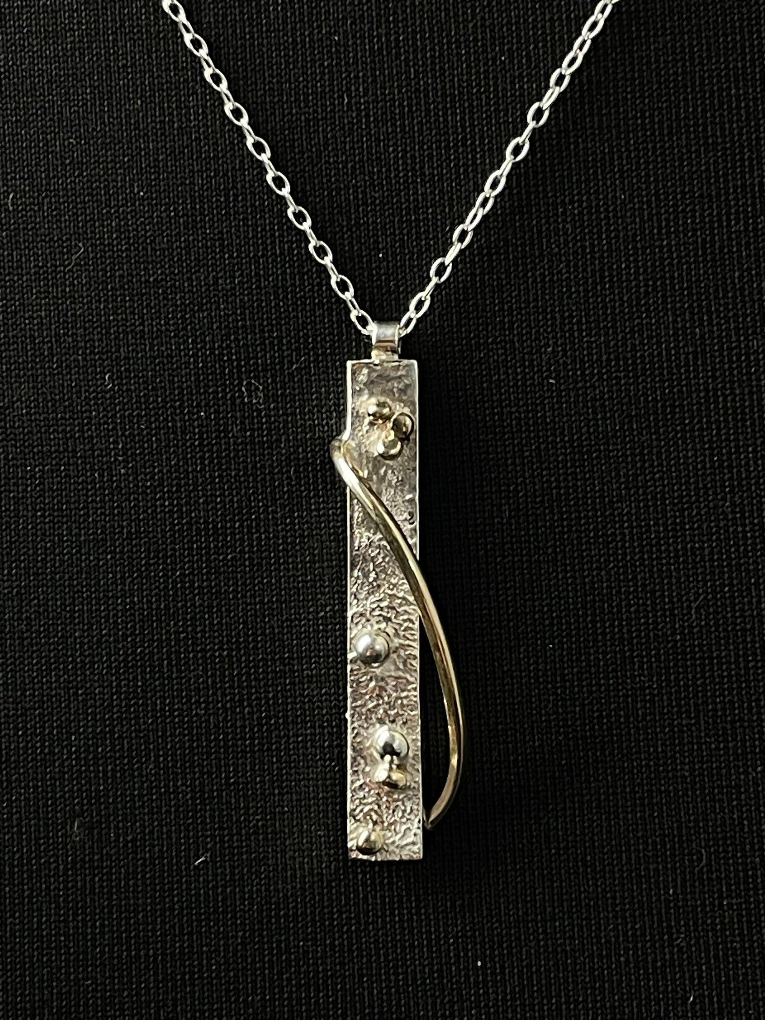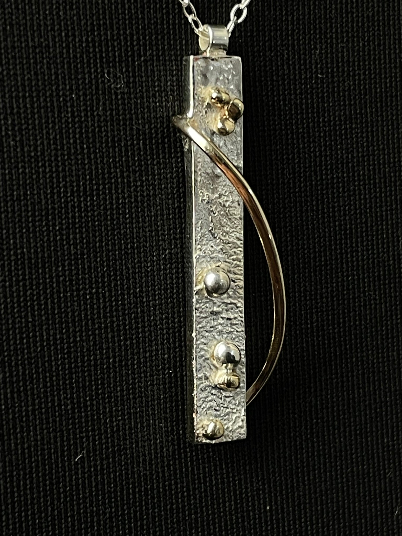 Inspired by my daughter's fascination with the cosmos, this sterling silver pendant captures the moon's ethereal beauty. The reticulated surface mimics the lunar landscape's intricate texture, whilst delicate gold granulation and a graceful gold wire swirl evoke the moon's celestial dance around Earth. This piece transforms a slice of the moon into a cherished keepsake you'll treasure forever.