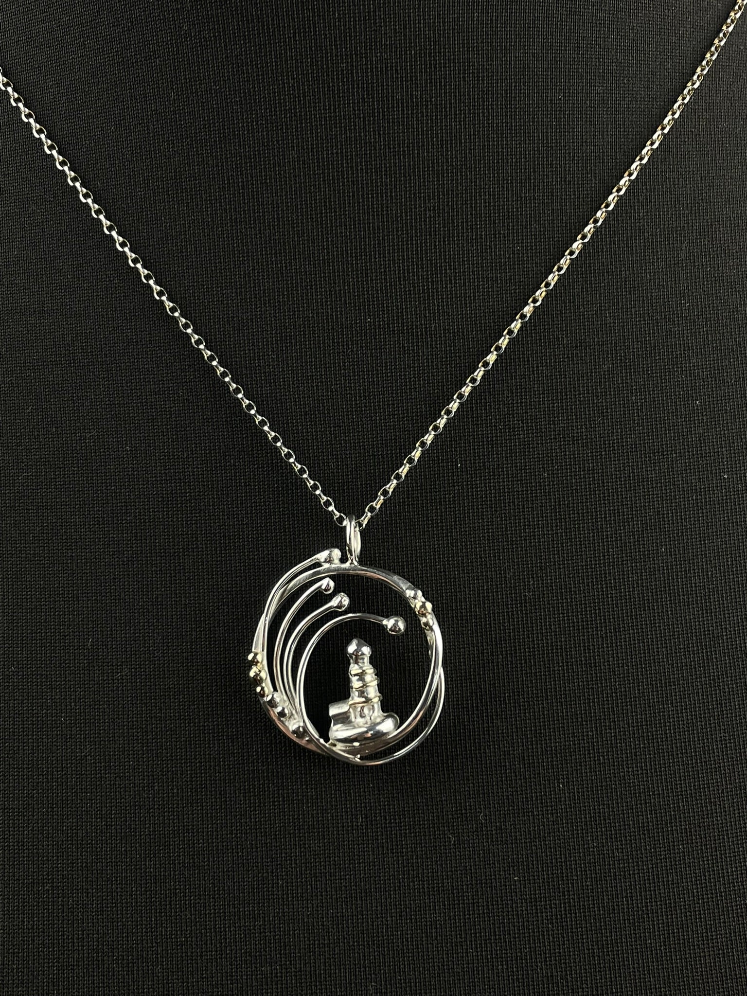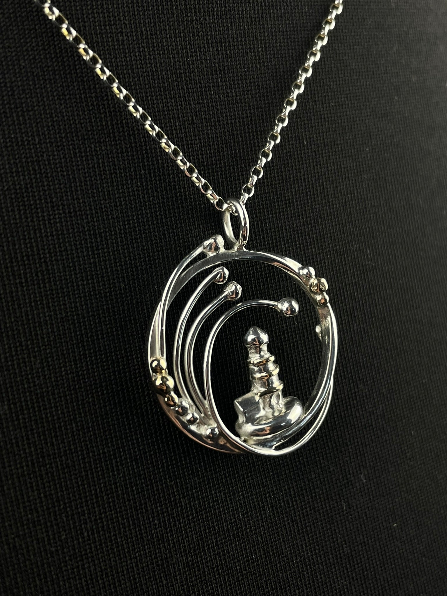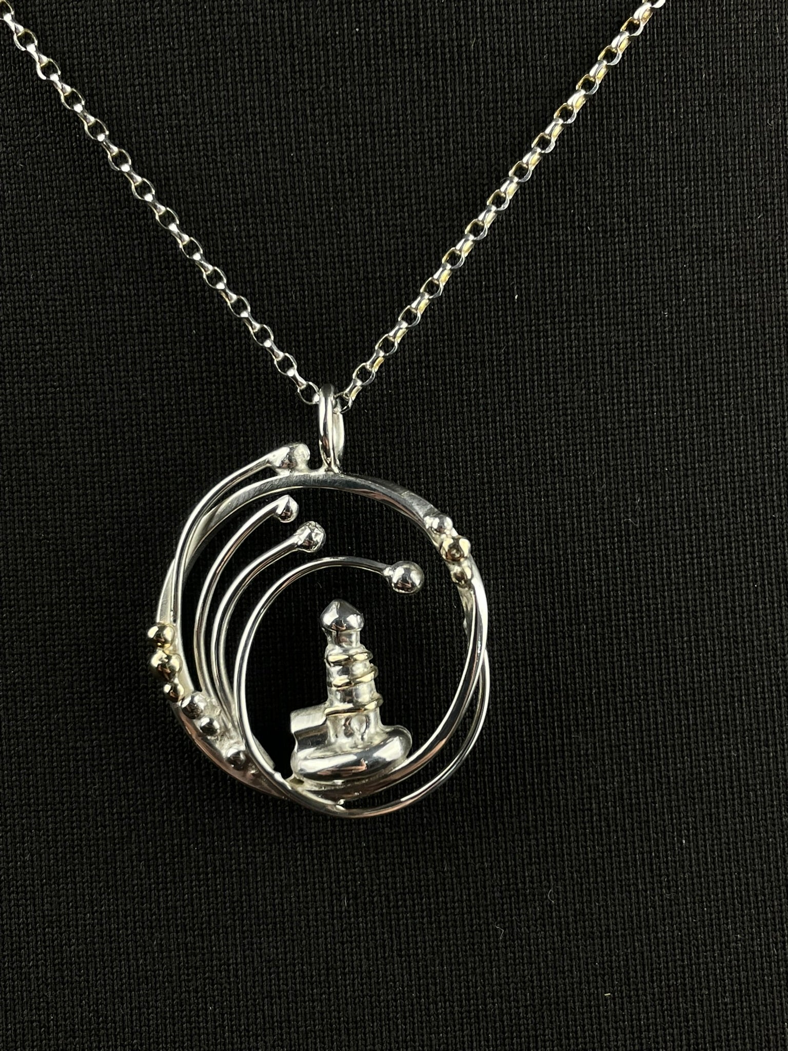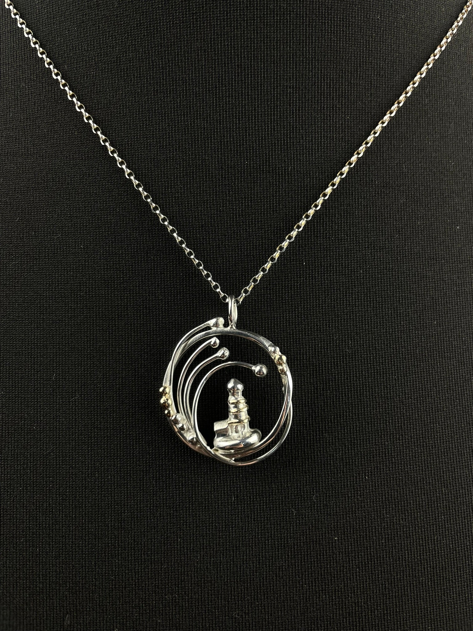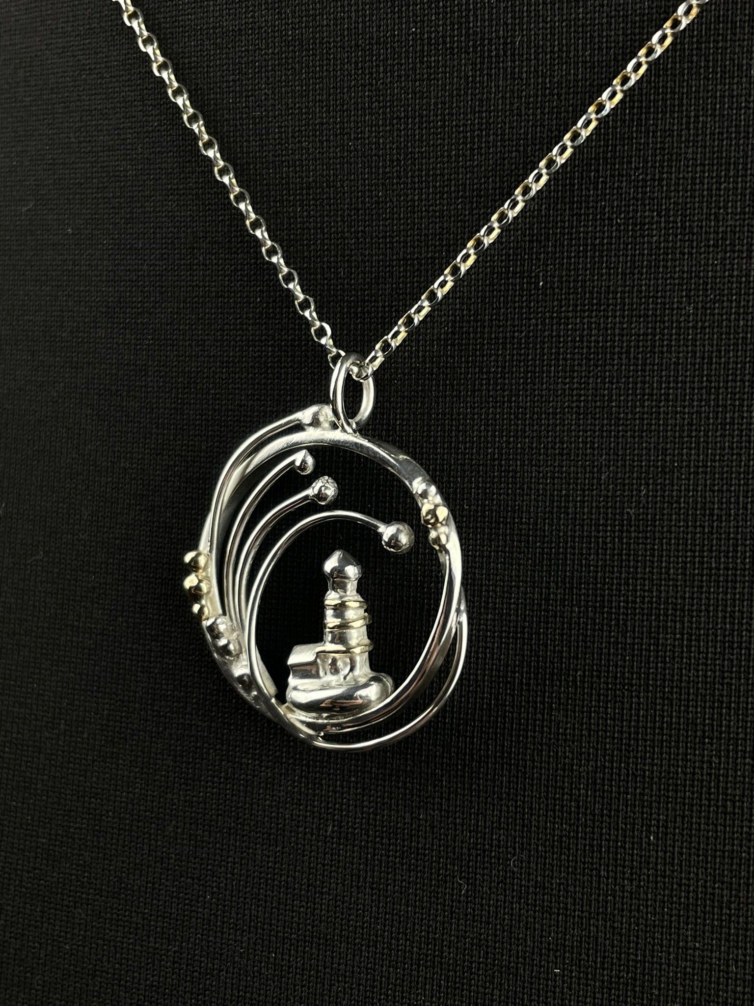 This exquisite sterling silver lighthouse pendant captures maritime elegance with striking yellow gold stripes and a charming adjoining cottage. A dynamic swirling wave encircles the piece, adorned with delicate 9ct gold sea spray accents that add movement and sophistication. The design merges fine craftsmanship with nautical inspiration, creating a distinctive statement piece. Suspended on an 18" chain, it's proportioned for everyday wear or layering. Perfect for those who appreciate detailed jewellery with narrative depth and precious metal quality.